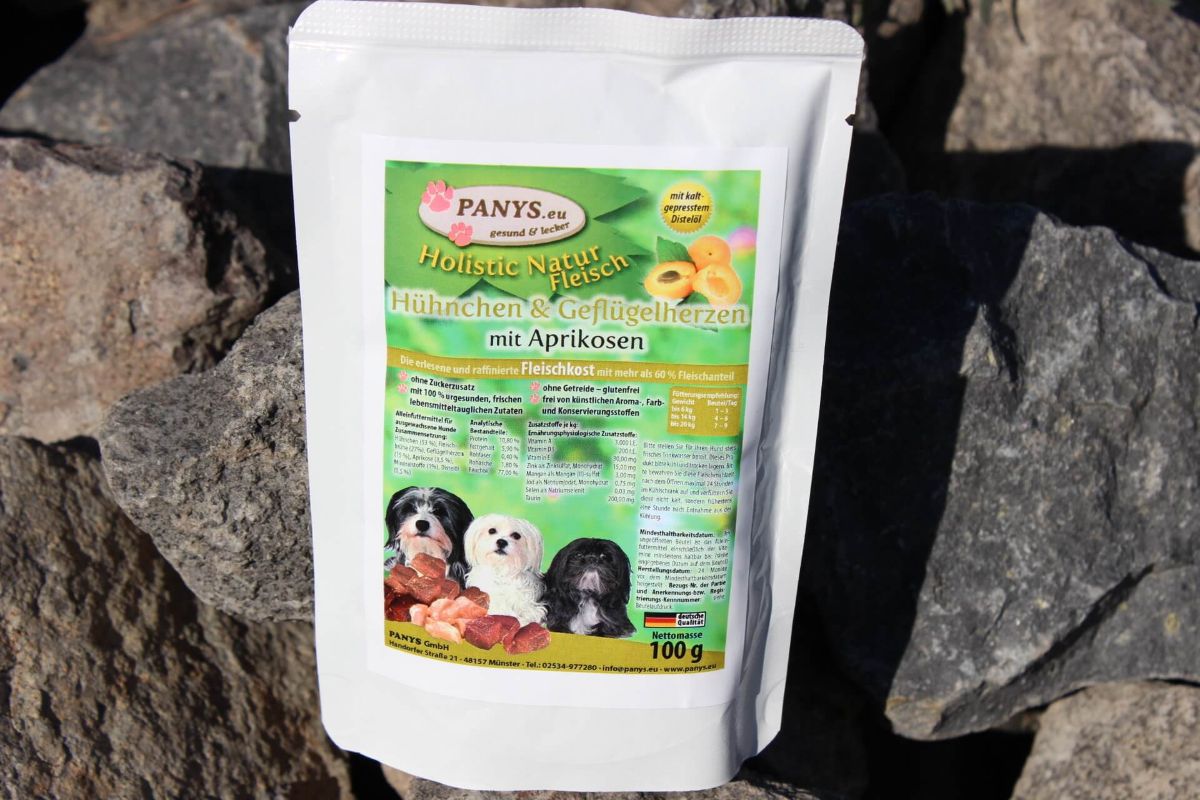 Alle Hunde lieben sie, unsere "Special Edition" mit Aprikose ! Für Magen-Darm sensible Hunde bestens geeignet und obendrein lecker. Der Fleischanteil von insgesamt 68,0 % besteht nur aus Huhn und Geflügelherzen, sowie Fleischbrühe nur vom Geflügel (also kein Rind ect. enthalten).