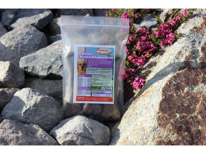 PANYS kleine Straussenknochen gibt es im praktischen wieder erschließbaren Beutel. Drei Kleine Straussenknochen pro Verpackungseinheit.