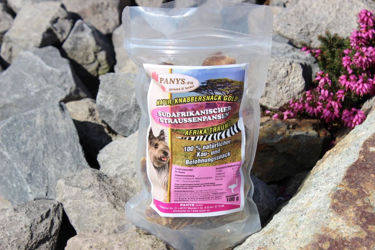 Südafrikanischer Straußenpansen besonders für ernährungssensible Hunde. PANYS Naturknabbersnack Gold "Afrika Träume". Der Knabberspaß, der nicht auf die Hüfte geht! Hier hat Ihr Liebling mal etwas zum knabbern, es ist wichtig für jeden Hund, die Kaumuskulatur zu trainieren. Außerdem kann dadurch die Zahnsteinbildung verhindert und die Kaumuskulatur gestärkt werden.